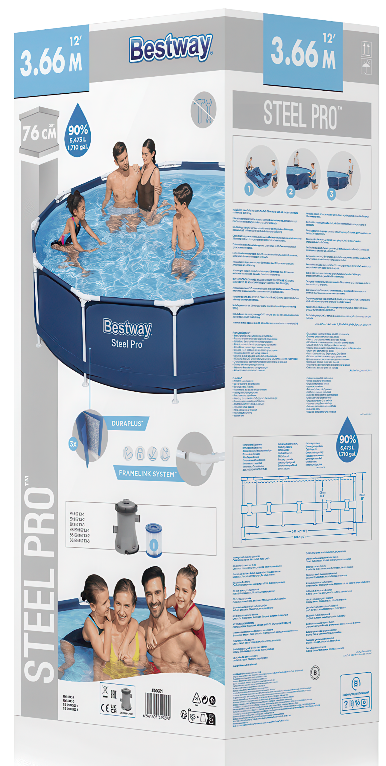 Наземний басейн Bestway Steel Pro - це фантастичне доповнення до будь-якого двору, що забезпечує багато годин веселощів і розваг для всієї родини. Міцна конструкція цього басейну гарантує, що він служитиме протягом багатьох років. Стійка до корозії металева рама оснащена системою FrameLink, яка забезпечує надійне і безпечне з'єднання між елементами рами. Захисні з'єднання допомагають запобігти пошкодженням, спричиненим контактом металу з металом, і підвищують загальну довговічність басейну.